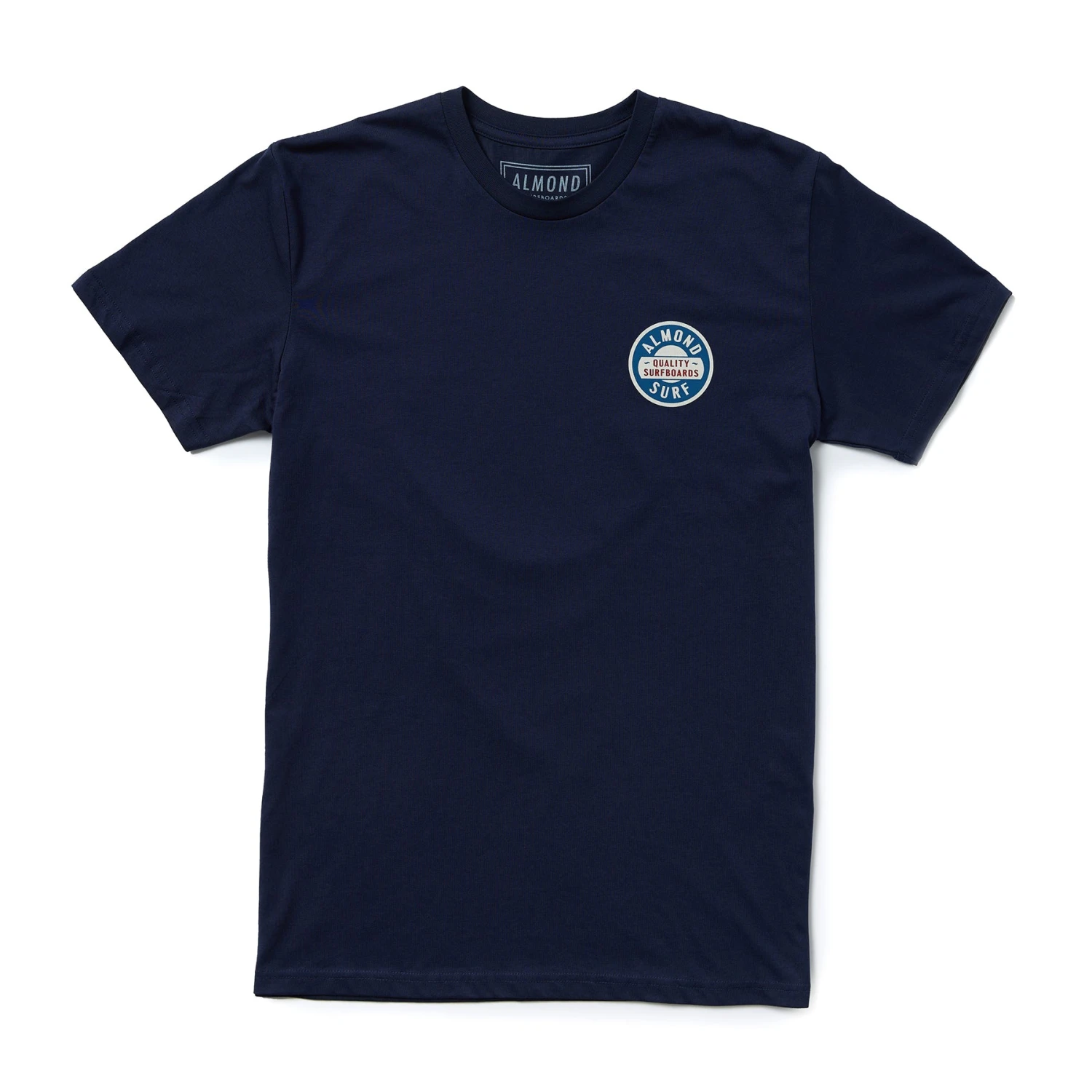 Expertly printed in California, this 100% cotton navy tee features the new almond surfboards badge logo, showcasing the brand’s commitment to quality and style. Illustrated by Steve Wolf for Almond Surfboards.